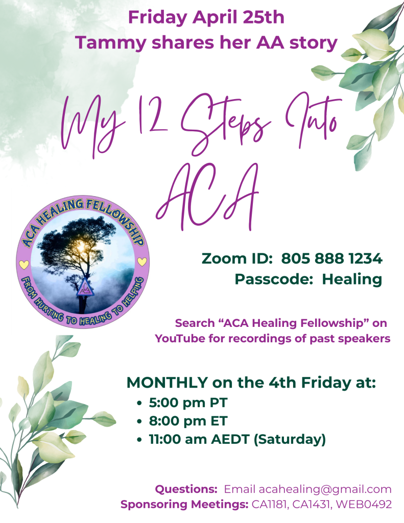 We have our 4th of 6 speakers scheduled to share her story on how ACA supports her with her other 12 step program(s). The speaker shares for up to 20 mins and then we open the session up to Q&A. Once Q&A completes, if there is still time remaining, we open up the meeting to general sharing.