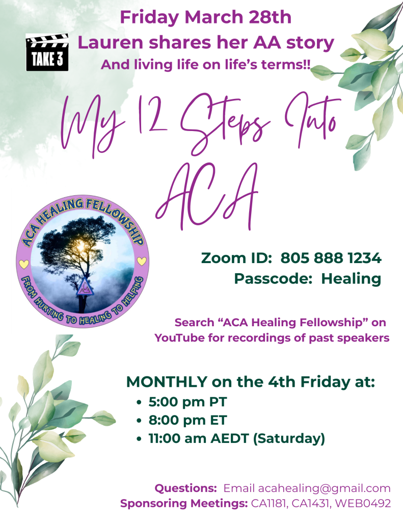This is our 3rd of 6 speaker meetings where speakers share about how ACA relates to their other 12 step programs. Our initial speaker has had unexpected events each time so we’ve had these programs shared so far (e.g., CODA, SAnon, NA, AA). Lauren will speak this month on AA. Other 12 step program perspectives coming in the next few months include SLAA, CMA, OA, and Alanon.